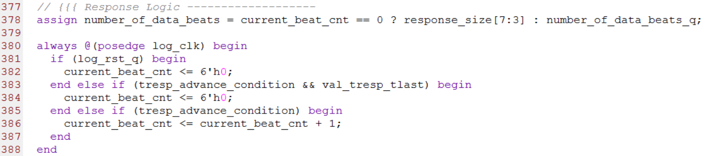 第378行到第388行用来产生有效时钟的总数number_of_data_beats以及有效时钟计数器current_beat_cnt。这段逻辑与srio_request_gen.v中对应的逻辑完全一致。源代码如下图所示