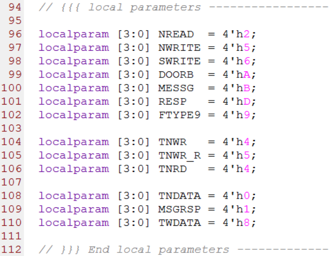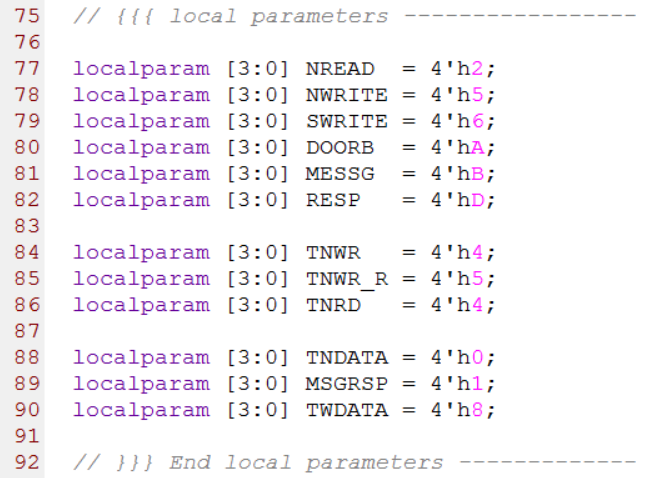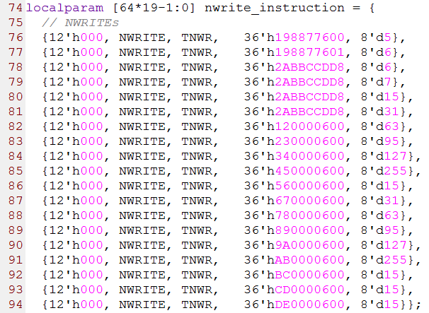 第74行到94行是19个NWRITE事务(写事务),其中第1列的12位数据是由8-bit的srcTID,1-bit的保留位,2-bit的prio和1-bit的CRF组成,第2列是FTYPE字段,第3列是TTYPE字段,第4列的36-bit数据是由最高2-bit的保留位和34-bit的address字段组成,第5列是size字段,这个字段的值为实际的数据量减1。比如size=0,表示实际传输的数据量为1。源代码如下图所示