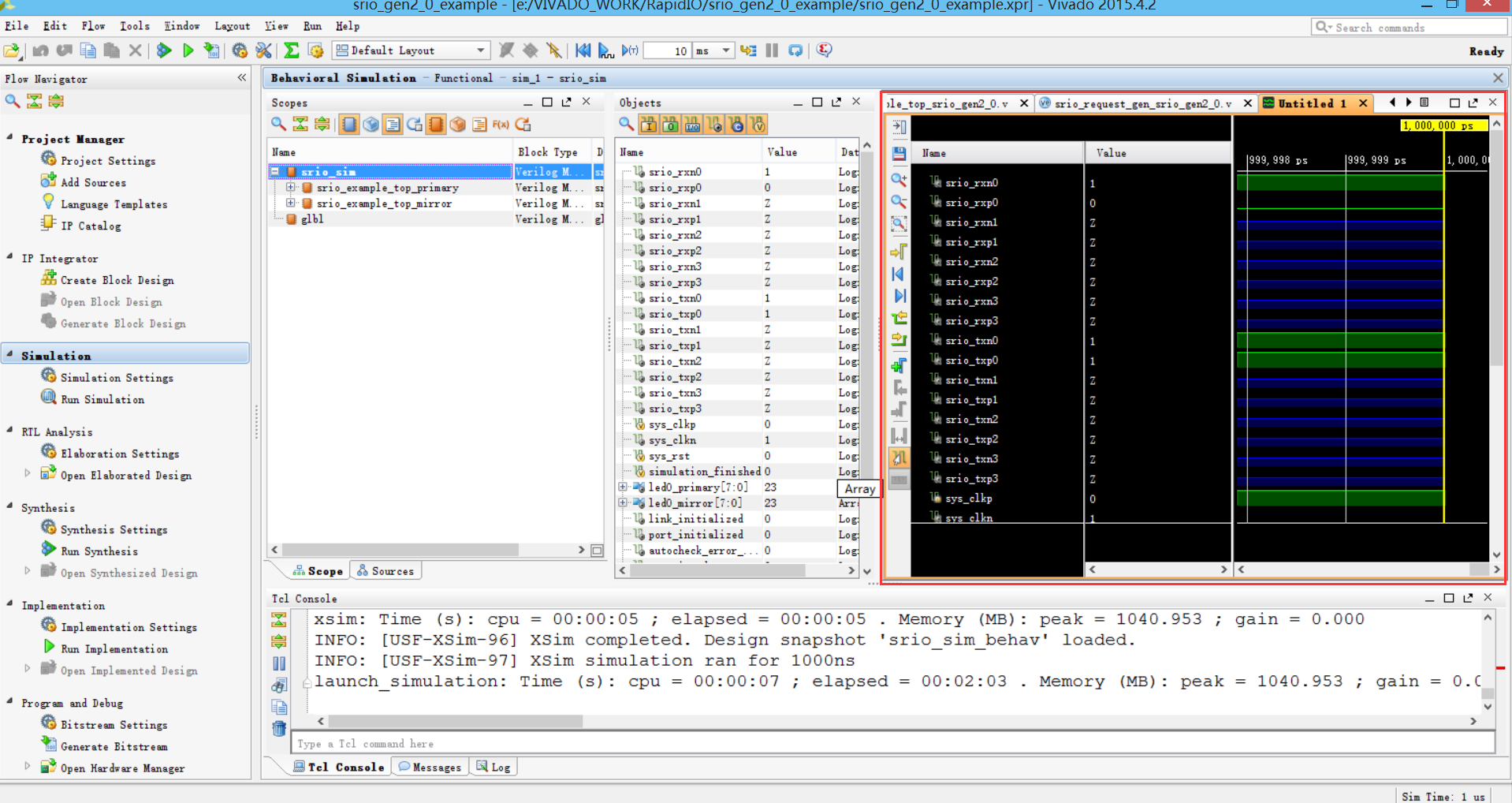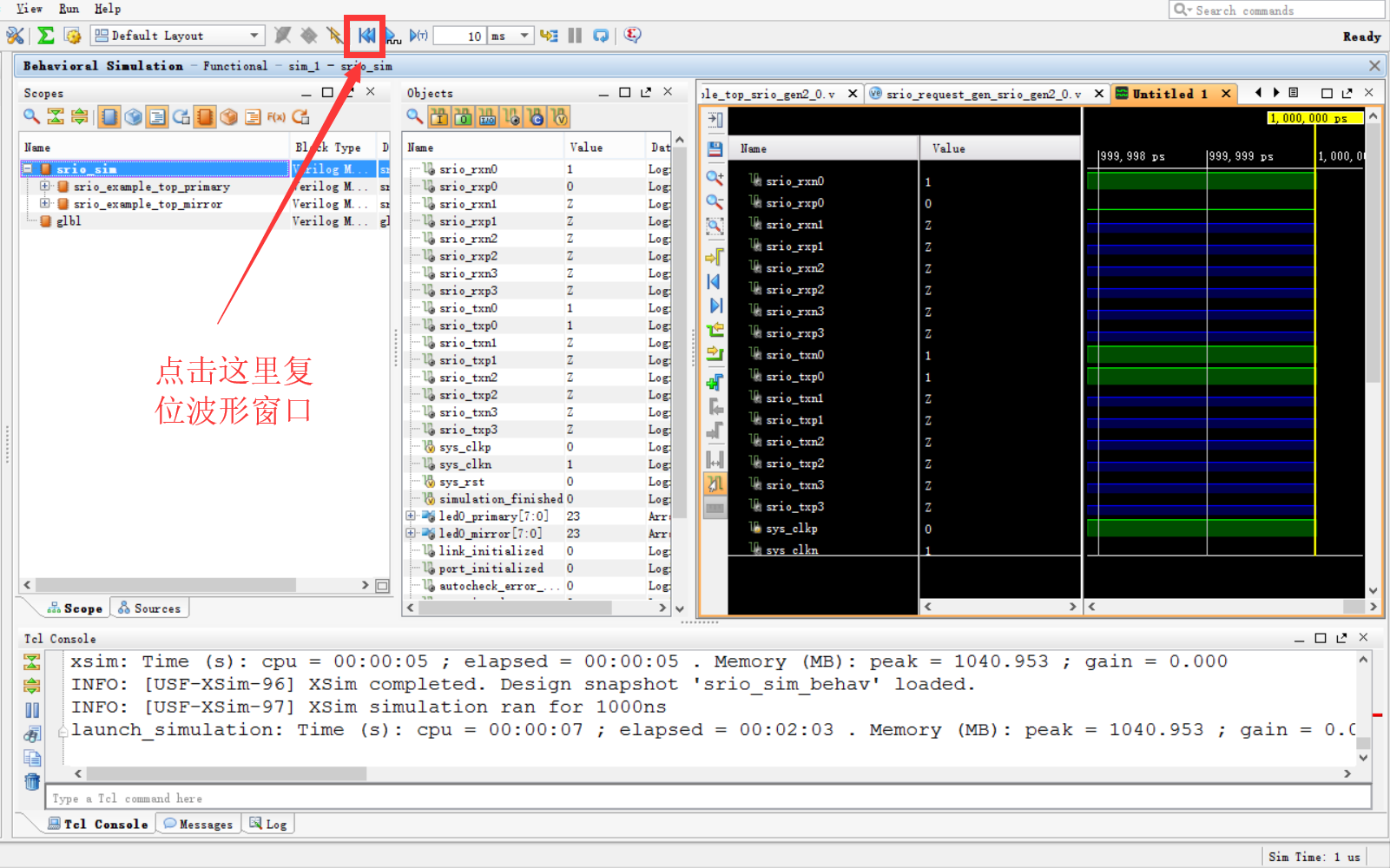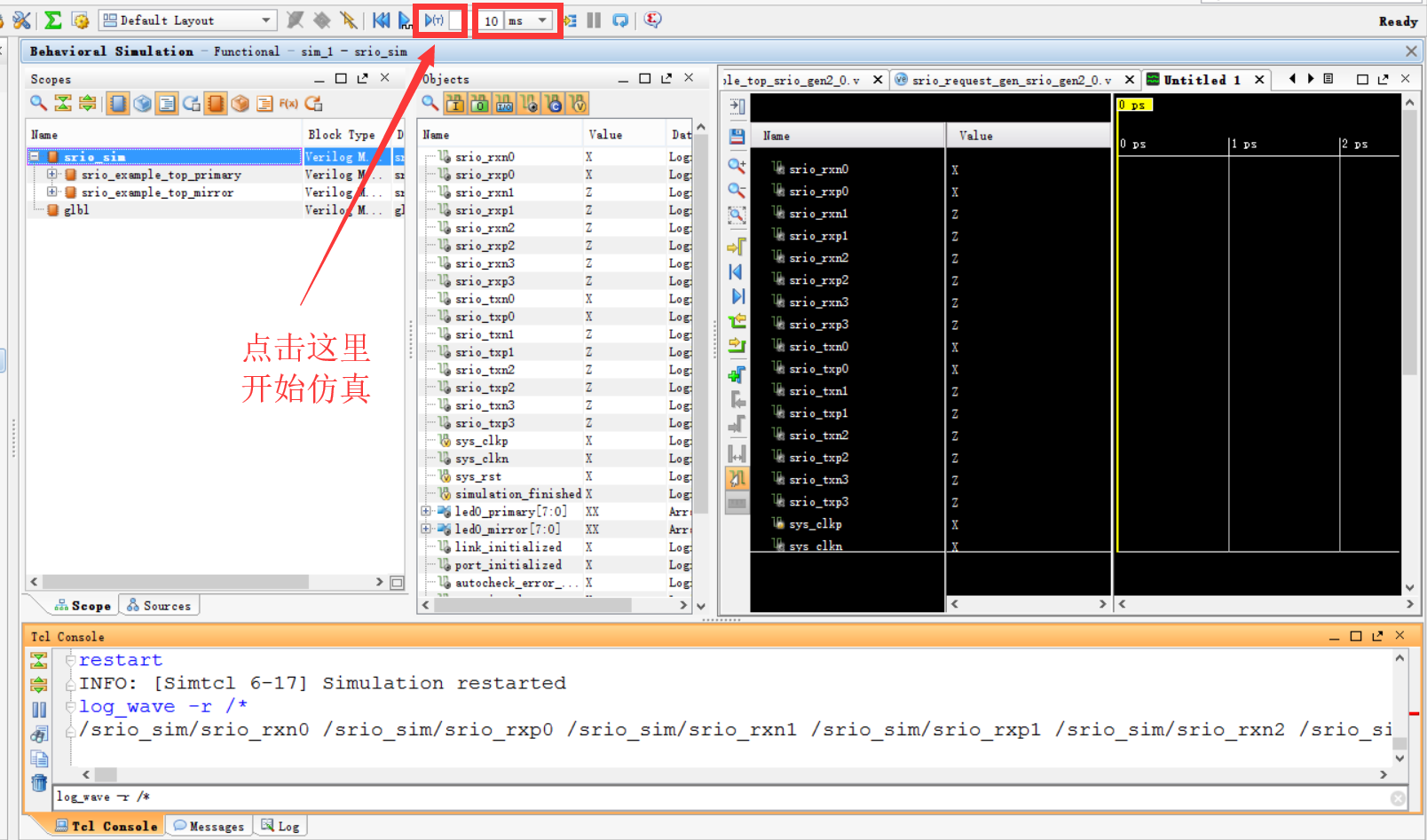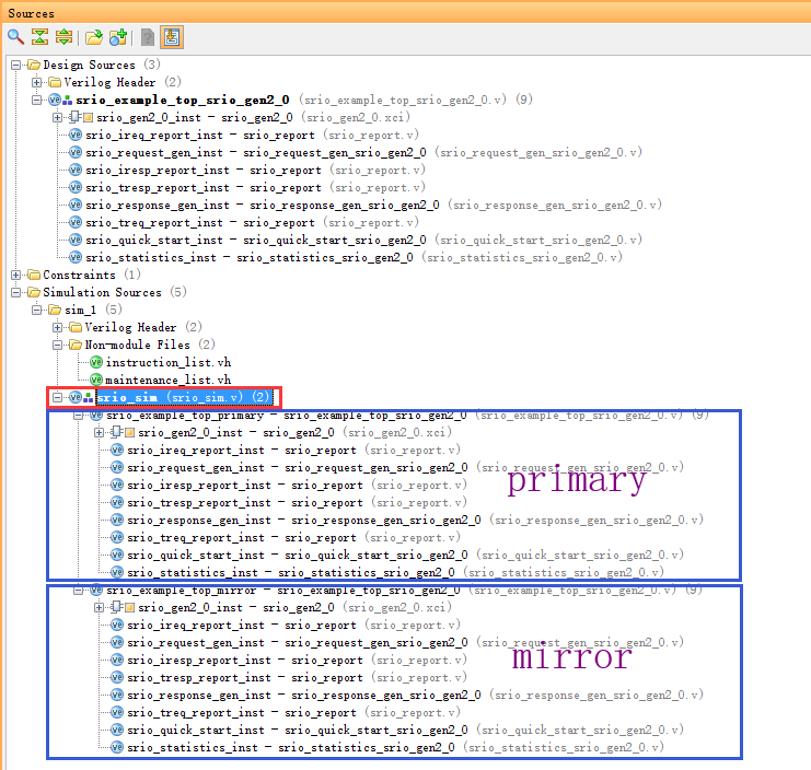 RapidIO核的例子工程的仿真顶层代码里面例化了两个实体,一个叫做srio_example_top_primary,另外一个叫做srio_example_top_mirror,如下图所示