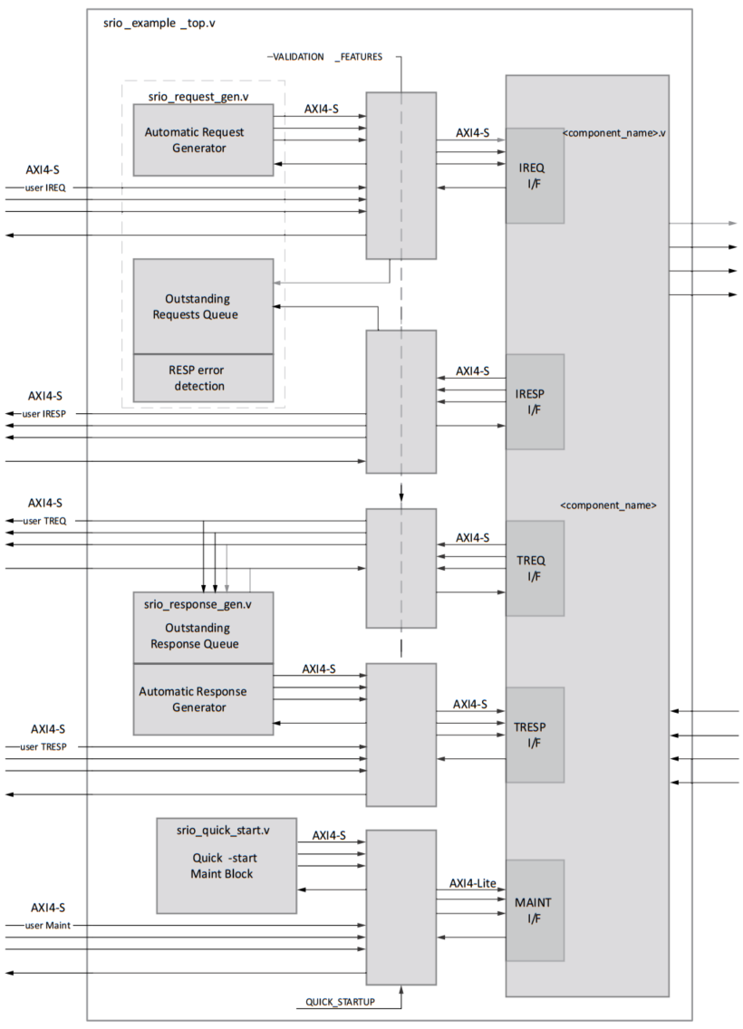 如果要使用外部接口产生I/O事务,那么需要设置参数VALIDATION_FEATURES=0,并且取消顶层模块srio_example_top.v中外部接口(axis_ireq_*,axis_tresp_*, axis_iresp_*, axis_treq_*, axis_iotx_*, axis_iorx_*)的注释。如果要使用外部接口产生维护事务,那些需要设置参数QUICK_STARTUP=0,并且取消顶层模块srio_example_top.v中外部接口(axis_maintr_*)的注释。使用外部接口的工程结构如下图所示