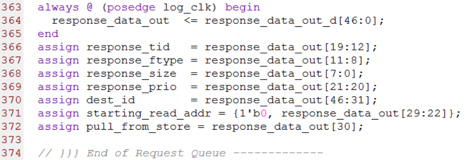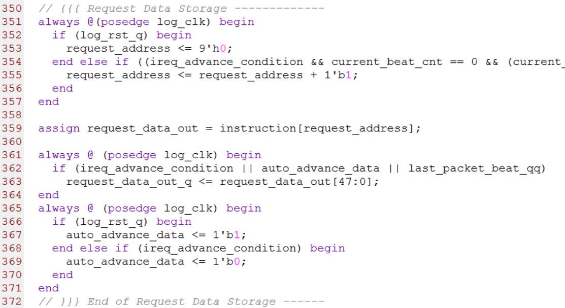 第351行到第371行与数据的存储相关。每当current_beat_cnt的值为0时,request_address变量加1, request_address也被赋给了tid,也就是说request_address也是事务ID值,同时request_address也是instruction的索引值。源代码如下图所示