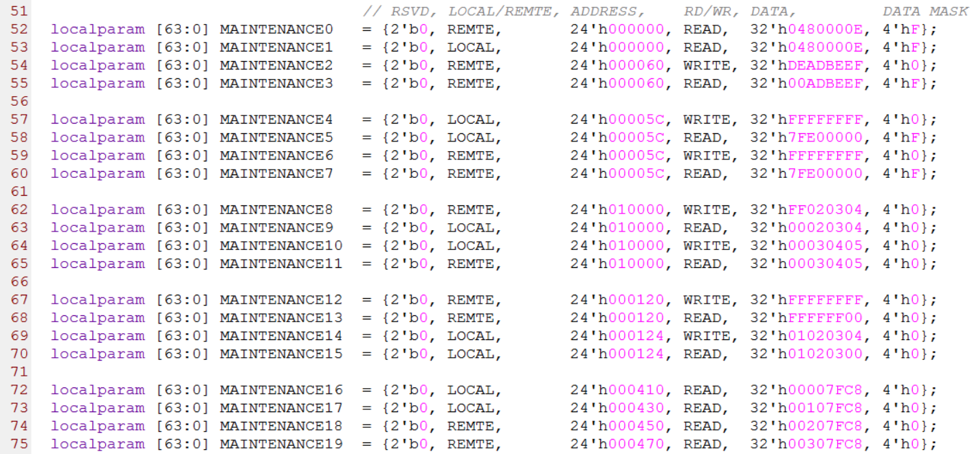 maintenance_list.vh头文件主要定义了维护事务相关的字段,其中第1列为2-bit的保留位,第2列为1-bit的远程/本地控制位,第3列为24-bit的地址,第4列为读/写控制位,第5列为32-bit的数据,第6列为4-bit的数据掩码(DATA MASK),部分源代码如下图所示