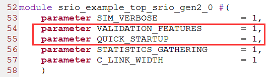默认情况下,由于例子工程的顶层srio_example_top.v模块中,VALIDATION_FEATURES与QUICK_STARTUP两个参数均被设置为1,如下图所示