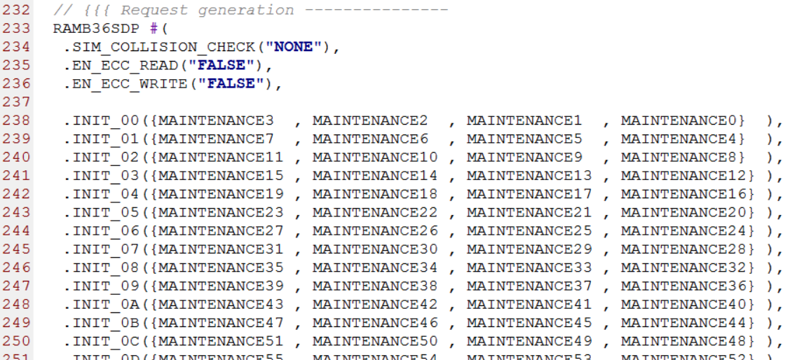 第233行到386行例化了一个RAMB36SDP原语,并用maintenance_list.vh头文件中定义的数据进行初始化。部分源代码如下图所示