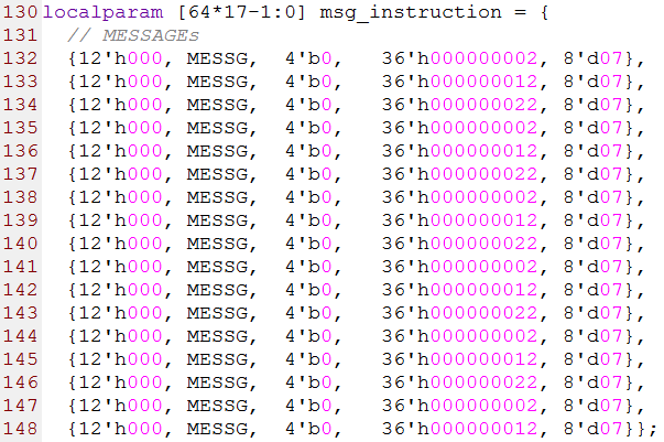 第130行到148行是17个MESSAGE事务(消息事务),其中第1列的12位数据是由4-bit的msglen,4-bit的msgseg,1-bit的保留位,2-bit的prio和1-bit的CRF组成,第2列是FTYPE字段,第3列是保留字段(MESSAGE事务没有TTYPE字段),第4列的36-bit数据是由最高26-bit的保留位,6-bit的mailbox字段,2-bit的保留位以及2-bit的ltr组成。第5列是8-bit的size字段。源代码如下图所示