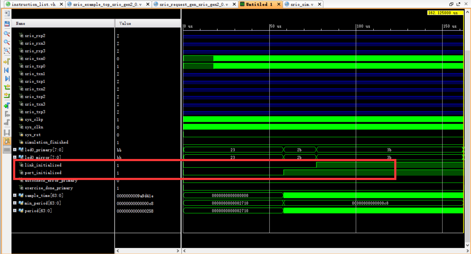 最后仿真结束以后,重新回到波形界面可以看到波形都正常产生了。这里最重要的两个信号就是link_initialized与port_initialized,当他们为高表示整个链路初始化完毕。至此,整个仿真过程全部结束,下篇文章会详细介绍每种事务的时序图以及需要注意的一些细节。