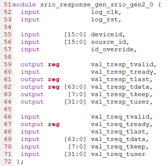 srio_response_gen.v源码的第51行到72行定义了模块的端口。log_clk和log_rst分别为逻辑层时钟与复位,tresp和treq为两个AXI4-Stream通道,tresp是响应事务传输通道,treq是请求事务传输通道。源码如下图所示