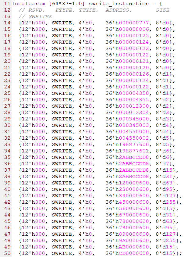 第11行到50行是37个SWRITE事务(流写事务),其中第1列的12位数据是由8-bit的保留位(SWRITE事务没有srcTID字段),1-bit的保留位,2-bit的prio和1-bit的CRF组成,第2列是FTYPE字段,第3列是保留字段(SWRITE事务没有TTYPE字段),第4列的36-bit数据是由最高2-bit的保留位和34-bit的address字段组成,第5列是8-bit保留字段(SWRITE事务没有size字段),不管这个字段的值为多少,目标设备都会把这个值当做0来处理。源代码如下图所示