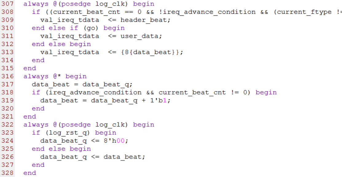 第307行到328行用来产生AXI4_Stream总线中的tdata信号,当有效时钟计数器current_beat_cnt为0时,tdata为包头header_beat,包头header_beat后面是待发送的数据data_beat,例子工程为了简单起见,发送的数据是累加数,每个累加数为8-bit,然后把每个累加数拼接8次作为待发送的数据,也就是说,待发送的数据为64’h0000000000000000,64’h0101010101010101,64’h0202020202020202,……..,后面以此类推。
