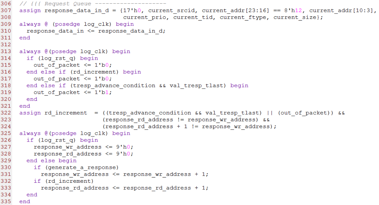 第307行到第335行是把请求事务的包头(Header)信息存储在RAM中。其中第307行到308行把请求事务中HELLO格式定义的各个字段进行拼接作为RAM的输入,第325行到第335行用来产生RAM的读地址与写地址。