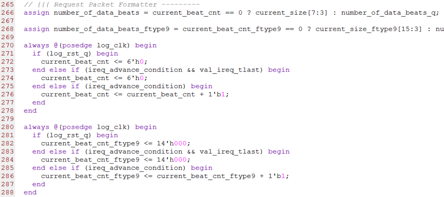 第266行到288行主要用来产生有效时钟计数器current_beat_cnt与有效时钟计数总数number_of_data_beats。当AXI4_Stream总线的tvalid和tready信号同时为高时,时钟为有效时钟,current_beat_cnt加1,当检测到tlast信号为高时表明最后一个数据已发送完毕,所以把current_beat_cnt清0。由于tdata的宽度为64-bit,也就是8个字节,所以有效时钟计数总数number_of_data_beats为current_size右移3位。源代码如下图所示