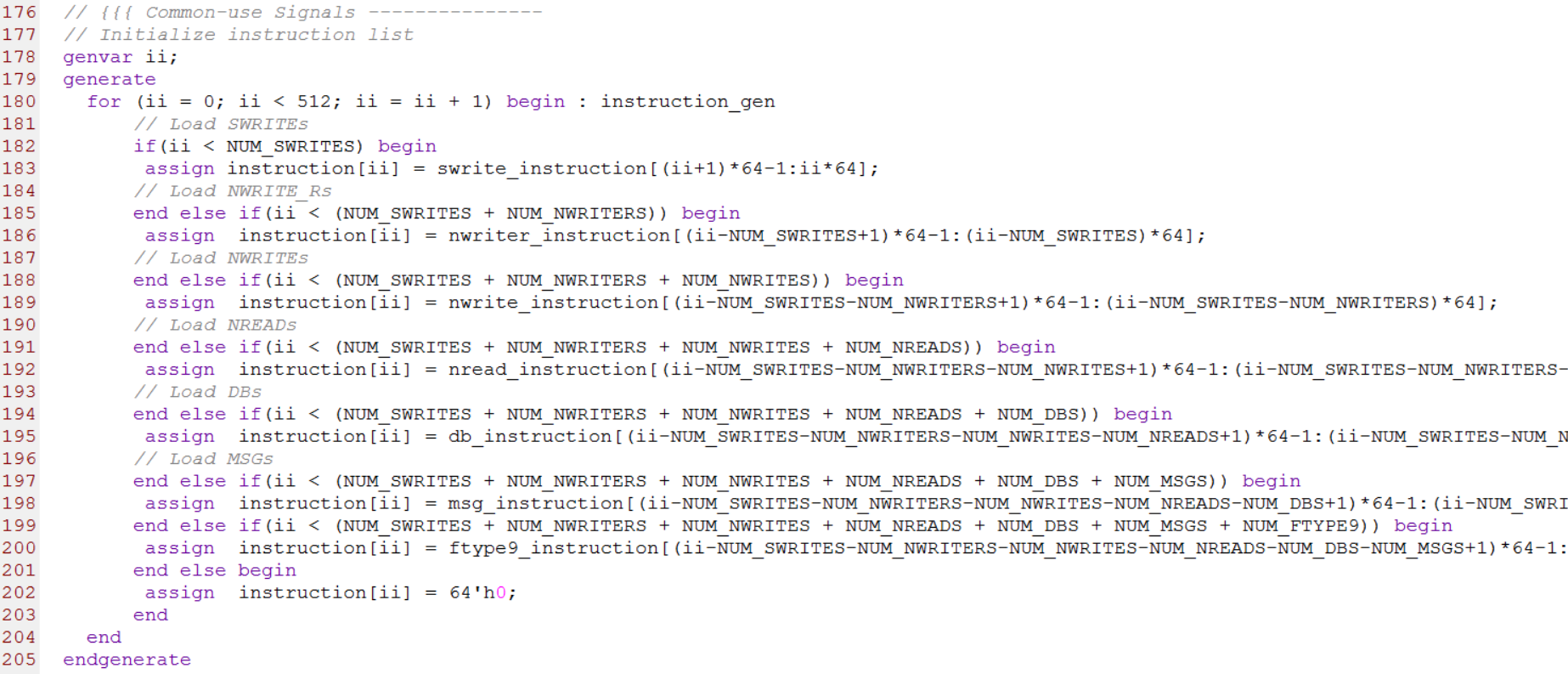 第178行到205行用来初始化事务列表,instruction[ii]存放的是instruction_list.vh头文件中定义的各个事务的相关字段值,源代码如下图所示