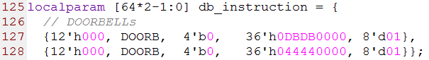 第125行到128行是两个DOORBELL事务(门铃事务),其中第1列的12位数据是由8-bit的srcTID,1-bit的保留位,2-bit的prio和1-bit的CRF组成,第2列是FTYPE字段,第3列是保留字段(DOORBELL事务没有TTYPE字段),第4列的36-bit数据是由最高4-bit的保留位,8-bit的信息高8位,8-bit的信息低8位以及最后的16-bit保留位组成。第5列是8-bit保留字段(DOORBELL事务没有size字段)。源代码如下图所示