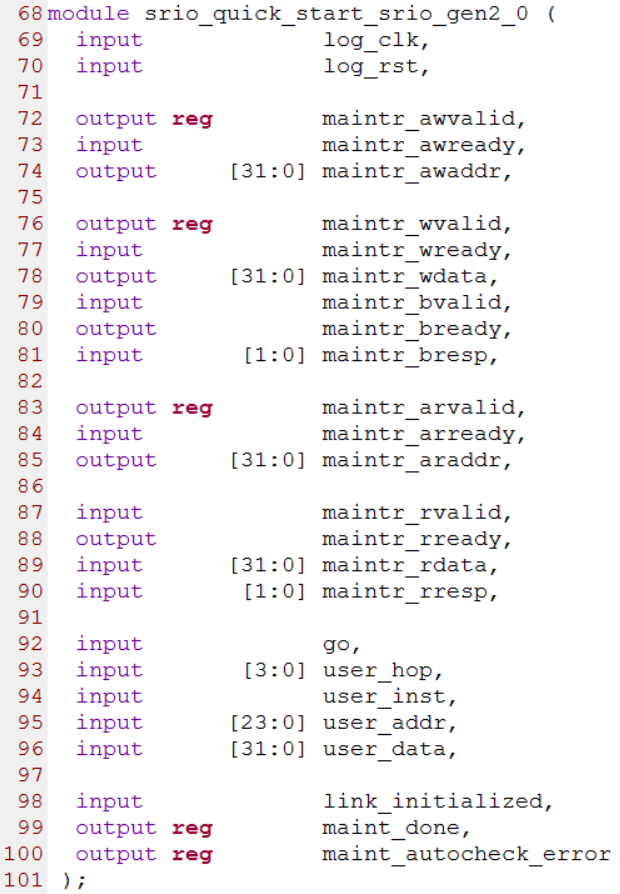 srio_quick_start.v源文件的第68行到第101行是接口定义。log_clk和log_rst分别为逻辑层的时钟和复位。以maintr_*开头的信号为AXI4-Lite通道的信号,以user_*开头的信号是用户自定义的维护事务的相关字段,go变量用来在用户定义和maintenance_list.vh头文件定义的字段中进行选择