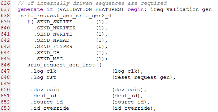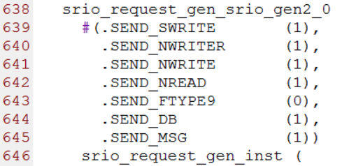 第637行到684行srio_request_gen.v模块用来生成请求事务。这个模块有7个参数,分别为SEND_SWRITE,SEND_NWRITER,SEND_NWRITE,SEND_NREAD,SEND_FTYPE9,SEND_DB和SEND_MSG。当他们设置为1时,srio_request_gen.v模块将会把instruction_list.vh模块中对应的事务发送给SRIO IP核。部分源码如下图所示