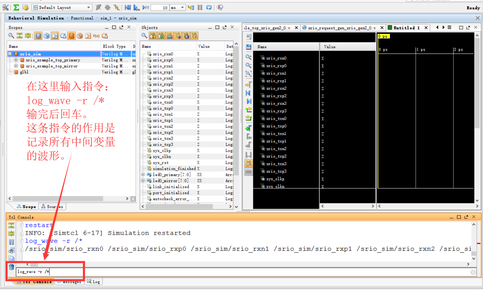 复位波形以后在Tcl Console中输入指令:log_wave –r /* 。输入完毕以后按回车。这条指令的作用是记录所有中间变量的波形,这样后面要观察任何变量的波形只需要把它拖到波形界面中它的波形就会自动显示出来而不需要重新仿真,大大节约了时间。如下图所示