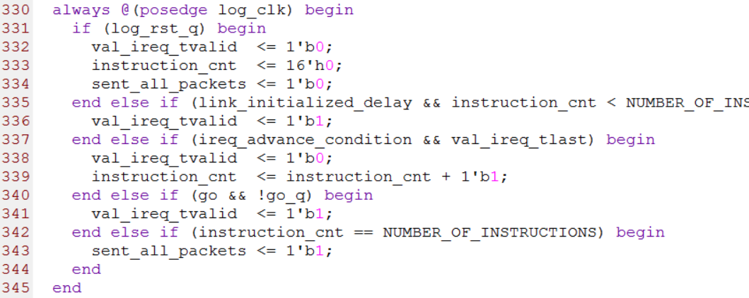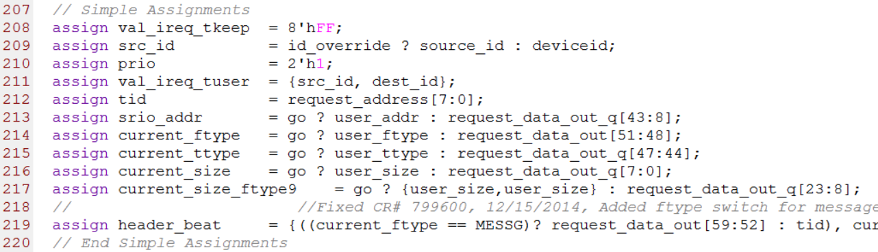 第208到第219行是一些简单的赋值操作。其中第208行的val_ireq_tkeep和val_ireq_tuser是根据HELLO格式的时序要求赋值的,HELLO格式的时序要求tkeep为8’hFF,tuser在第一个有效的时钟(log_clk)周期内由src_id与dest_id拼接而成。第213行和第217行的go变量用来选择HELLO格式包头各个字段由用户定义还是由instruction_list.vh定义。第219行的header_beat变量就是HELLO格式的包头,在第一个有效时钟(log_clk)周期,tdata上的数据必须为header_beat。源代码如下图所示