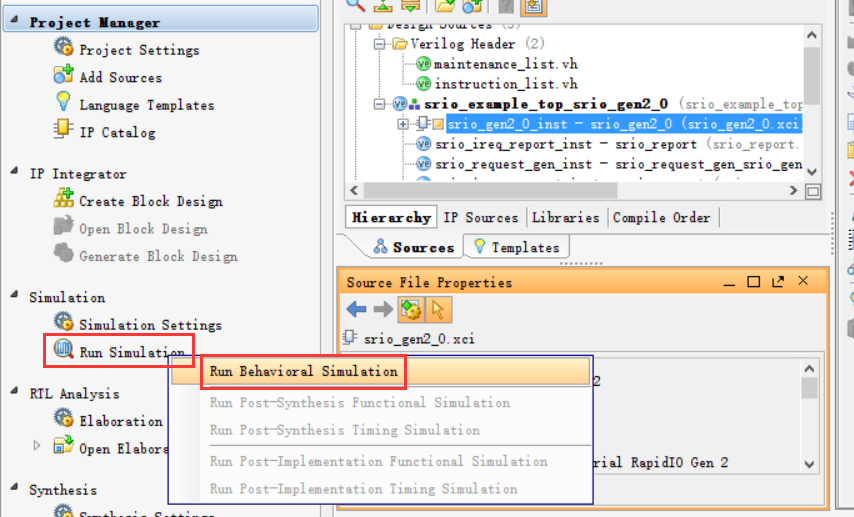 工程源码分析完毕以后,接下来就可以开始仿真了。例子工程中的代码一行都不要改,直接左键单击Run Simulation,在弹出的菜单中点击Run Behavioral Simulation,如下图所示