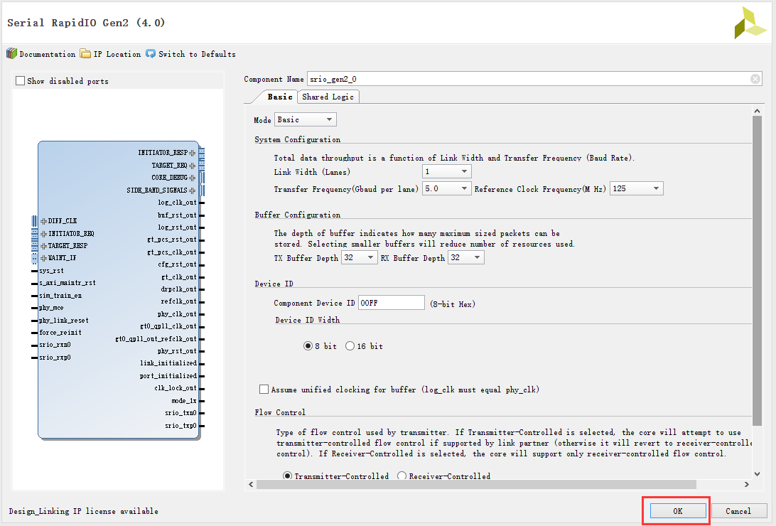 2、双击Serial RapidIO Gen2进入核的配置界面,所用参数全部保持默认,然后直接点击OK