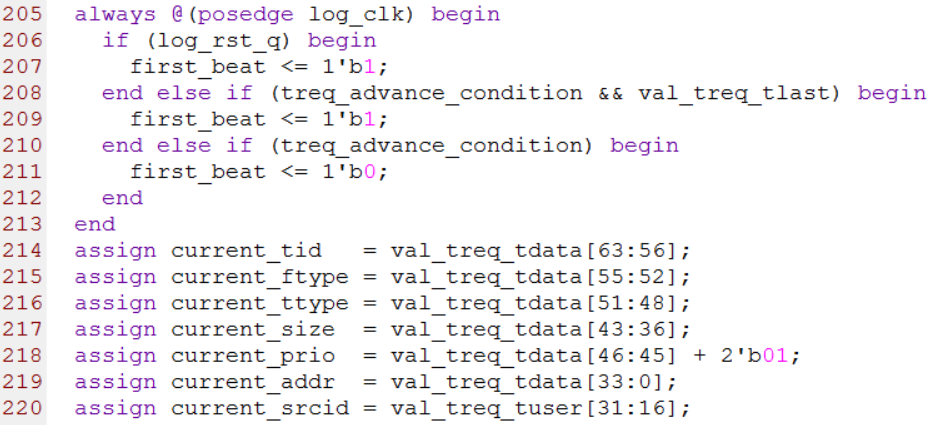 第205行到220行用来产生treq通道第一拍的标志信号,并把tdata中的数据按照HELLO格式的定义把对应的关键字段剥离出来,值得注意的是第218行优先级字段prio为tdata重对应的字段加1,原因是响应事务的优先级为请求事务的优先级加1,上篇博客也提到过这一点。这部分源代码如下图所示