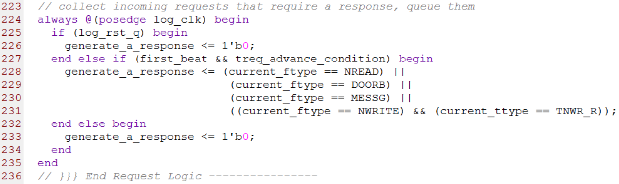 第224行到第235行用来生成有响应事务的标志,其中RapidiO协议中只有NREAD、DOORBELL、MESSAGE和NWRITE_R这几种事务有对应的响应事务。这部分源代码如下图所示