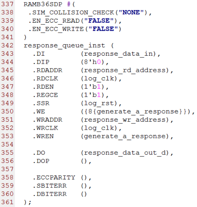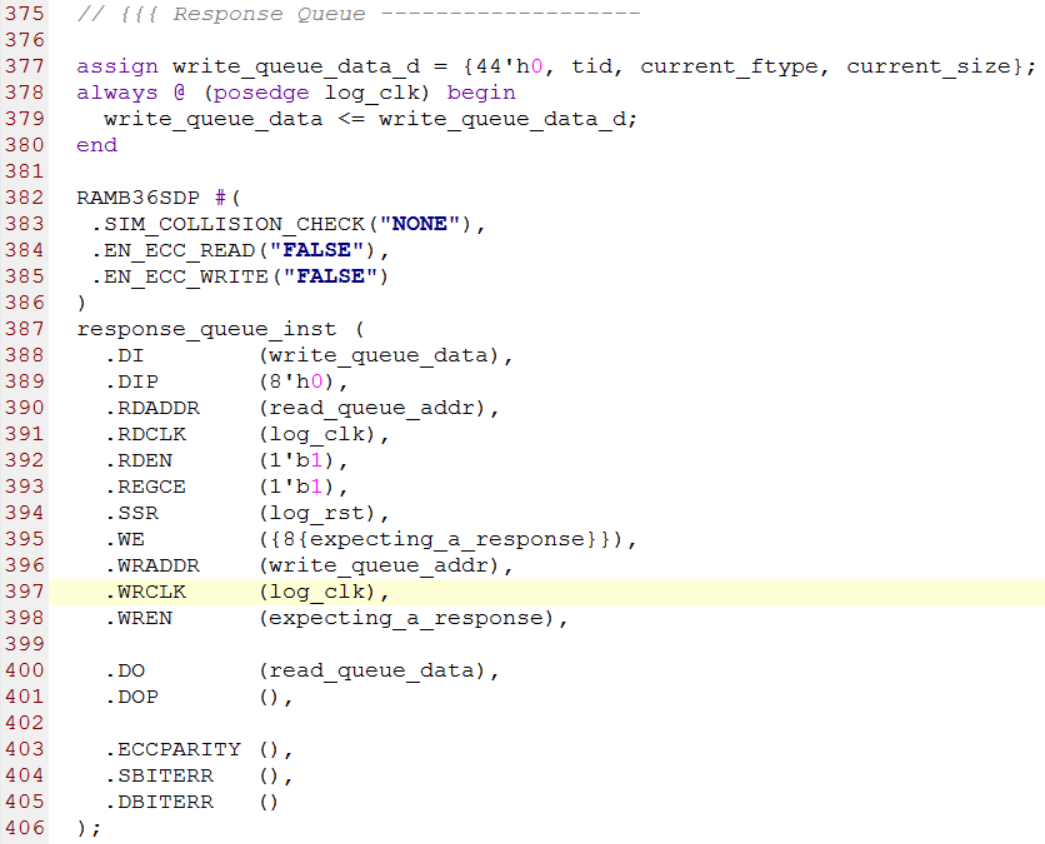 第382行到第406行例化了一个RAMB36SDP原语,RAMB36SDP是一个大小为36Kb的简单双口Block RAM(SDP=Simple Dual Port)。它的作用是把请求事务的tid,current_ftype和current_size写入RAM中存起来,对于有响应的事务,RapidIO会收到一个响应事务,收到响应事务事务以后可以把存放在RAMB36SDP中的数据读出来与响应事务中对应的字段进行对比从而对整个事务的交互过程的正确性进行一个初步判断。关于RAMB36SDP原语的详细解释请阅读下一小节。源代码如下图所示