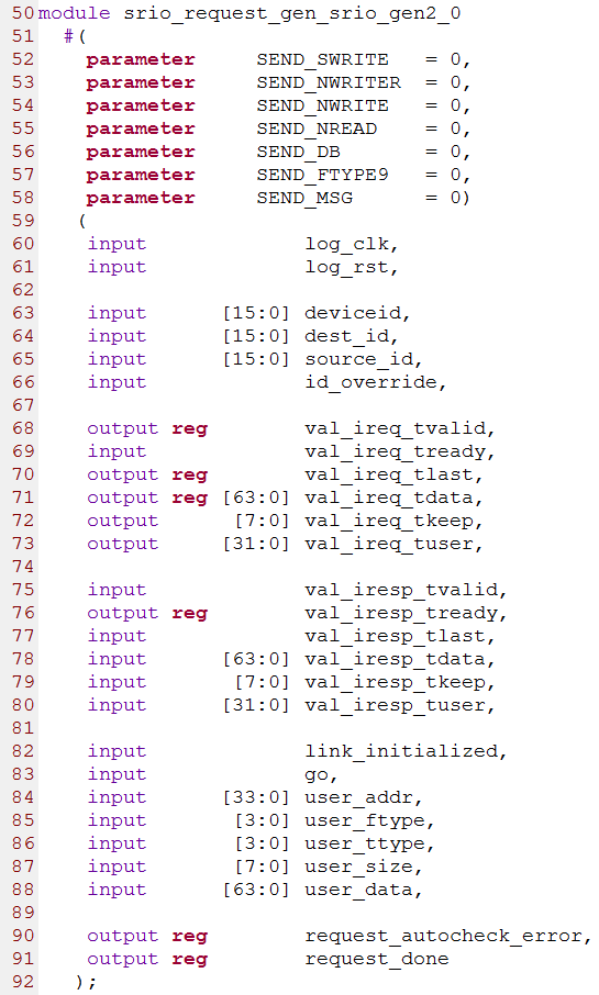 srio_request_gen.v源码的第50行到92行是参数与接口的定义。它包含7个参数,分别为SEND_SWRITE、SEND_NWRITER、SEND_NWRITE、SEND_NREAD、SEND_DB、SEND_FTYPE9和SEND_MSG,它们的默认值被设置为0,但是在顶层模块中例化的时候,它们的值分别被设置为1、1、1、1、0、1、1。如下图所示
