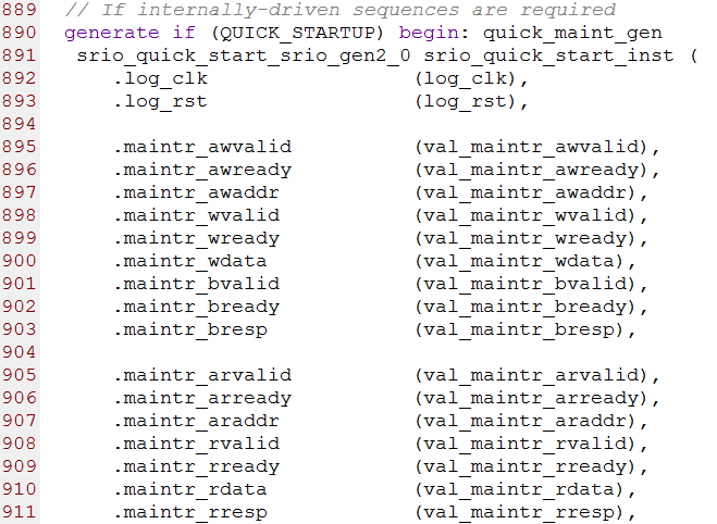 第890行到937行例化了srio_quick_start.v模块,这个模块产生维护事务来访问配置空间。部分源码如下图所示