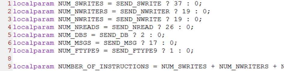 根据上面分析instruction_list.vh头文件可知,如果上面的7个参数为1的话,各个事务的个数应该由instruction_list.vh头文件中NUM_SWRITES、NUM_NWRITERS、NUM_NWRITES、NUM_NREADS、NUM_DBS、NUM_MSGS和NUM_FTYPE9决定。