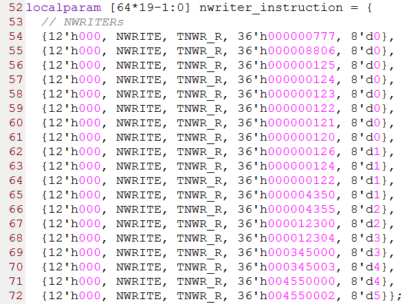 第52行到72行是19个NWRITE_R事务(带响应的写事务),其中第1列的12位数据是由8-bit的srcTID,1-bit的保留位,2-bit的prio和1-bit的CRF组成,第2列是FTYPE字段,第3列是TTYPE字段,第4列的36-bit数据是由最高2-bit的保留位和34-bit的address字段组成,第5列是size字段,这个字段的值为实际的数据量减1。比如size=0,表示实际传输的数据量为1。源代码如下图所示