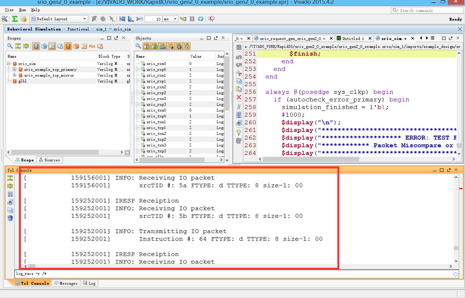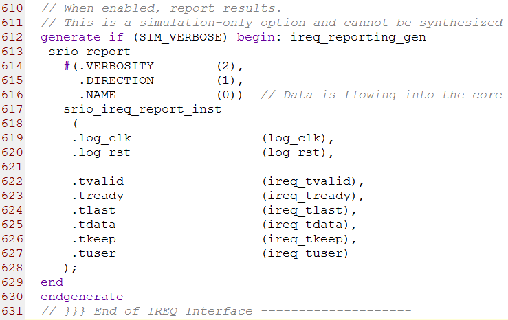 SIM_VERBOSE设为1时,可以利用srio_report.v模块生成不可综合的报告。为0时,此功能被屏蔽。