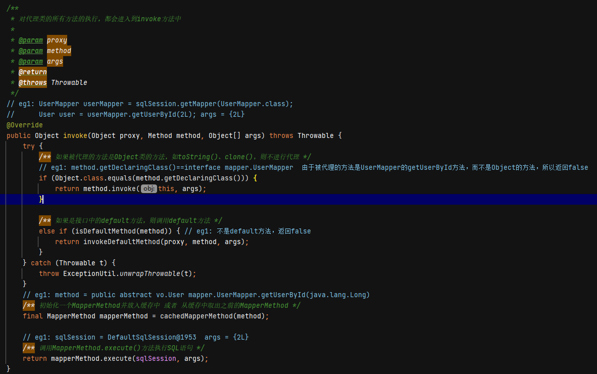 上文中说到MapperProxy是个代理类,那么代理类所有的方法执行都会经过invoke方法,现在让我们来看看它的invoke方法