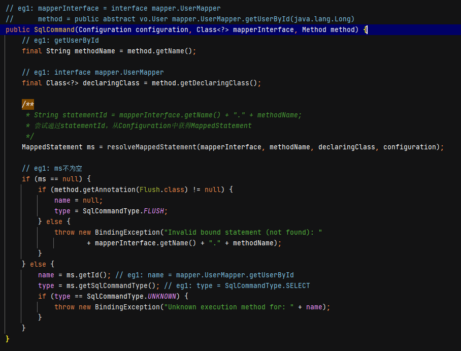 MappedStatement ms = resolveMappedStatement(mapperInterface, methodName, declaringClass, configuration);可以看出sqlCommand的构造主要操作都是获取MapperStatement这个对象