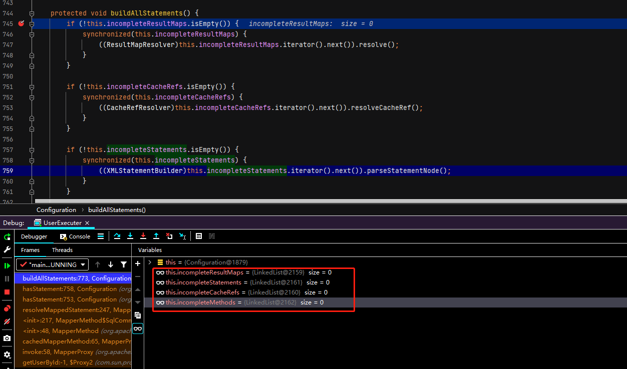 那么问题来了,我们之前也没有往里面put元素,看来mybatis在加载的时候已经做了初始化操作,具体初始化后续再说
