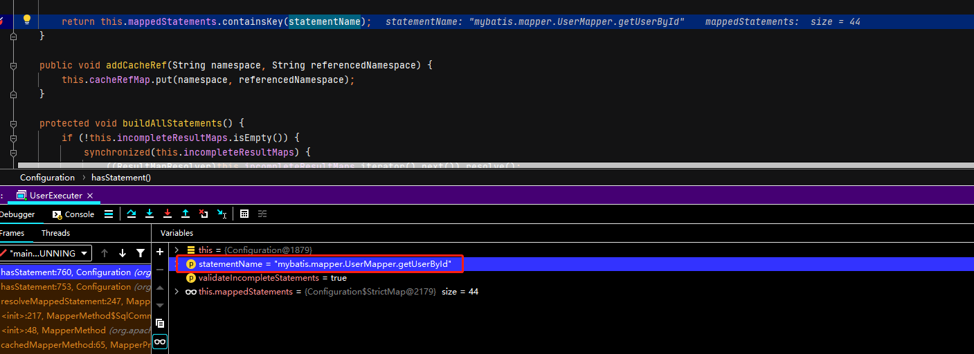 看了这么多,实际上就是判断之前Map<String,MapperStatement>之前是否存在getUserById这个mapper和方法,存在的话之前将Map中的MapperStatement返回