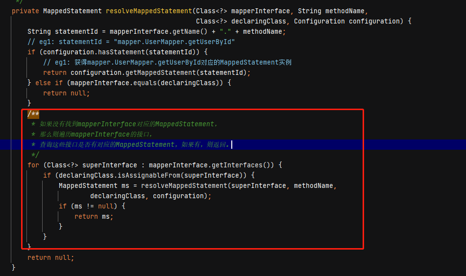 当然如果MapperStatement不存在的话,获取该类UserMapper.Class所有的接口中是否存在对应的MapperStatement,不存在直接返回null