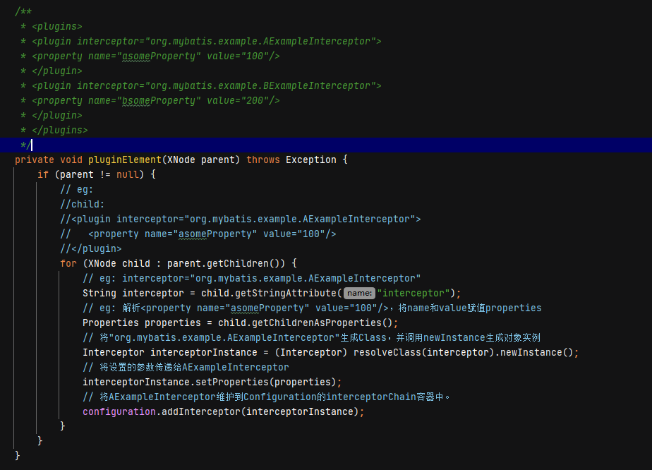 // 解析<plugins>标签,初始化Configuration的interceptorChain