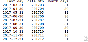 为得到每个月的天数,实际上就是每个月最后一天的日期,最终生成如下表格: