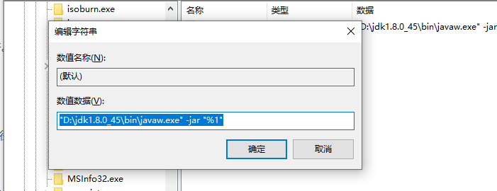 输入命令:"D:\jdk1.8.0_45\bin\javaw.exe" -jar "%1"