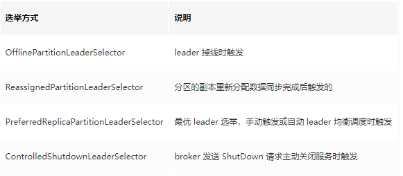 协调者通过ISR中的副本,依赖zookeeper来选举主分区。具体有下图几种方式。