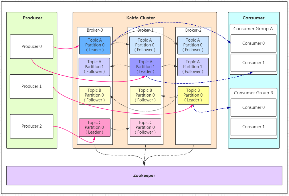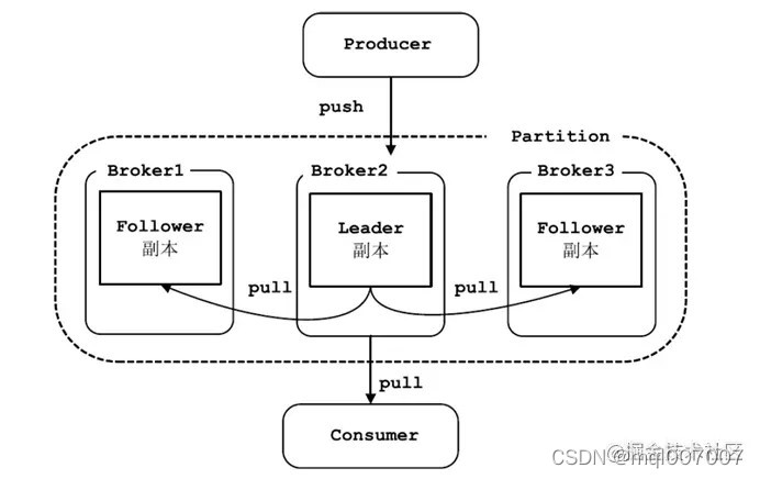 消息以partition为单位分配到多个server,并以partition为单位进行备份。备份策略为:1个leader和N个followers,leader接受读写请求,followers被动复制leader。leader和followers会在集群中打散,保证partition高可用。