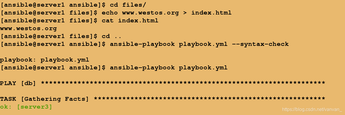 playbook执行时使用”ansible-playbook”命令后跟写好的yaml格式的playbook文件即可,