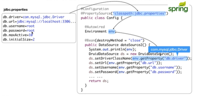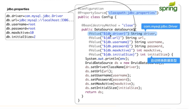 @PropertySource("classpath:jdbc.properties")//配置文件来源