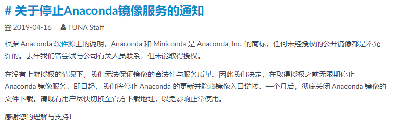 之前网上给出的解决方案都是使用清华的开源镜像,但是在不久之前清华大学开源软件镜像站已经停止了Anaconda镜像服务,希望能早日恢复