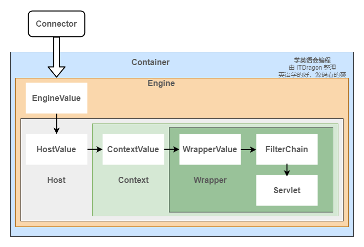 每个 Service 会包含一个容器。容器由一个引擎可以管理多个虚拟主机。每个虚拟主机可以管理多个 Web 应用。每个 Web 应用会有多个 Servlet 包装器。Engine、Host、Context 和 Wrapper,四个容器之间属于父子关系。