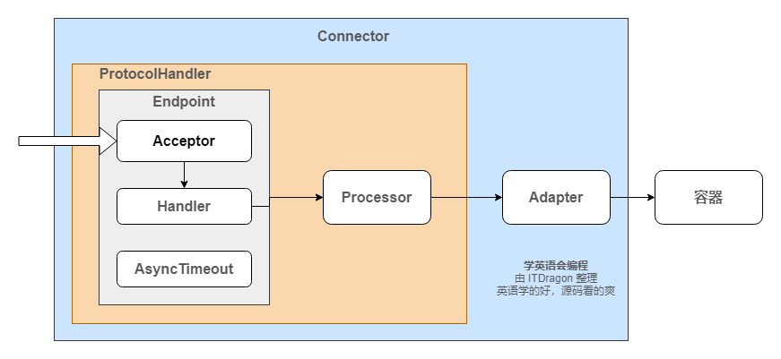为满足连接器的两个核心功能,我们需要一个通讯端点来监听端口;需要一个处理器来处理网络字节流;最后还需要一个适配器将处理后的结果转成容器需要的结构。