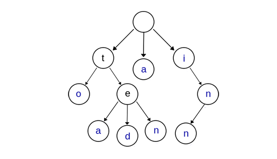 下图展示了一个小字典树,包括字符串:”to","tea","ted","ten","a","inn"