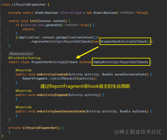 registerActivityLifecycleCallbacks() 是Application提供的一个方法,可以监控App内所有Activity的生命周期。只重写了 onActivityCreated(),通过 ReportFragment 来Hook宿主的生命周期。