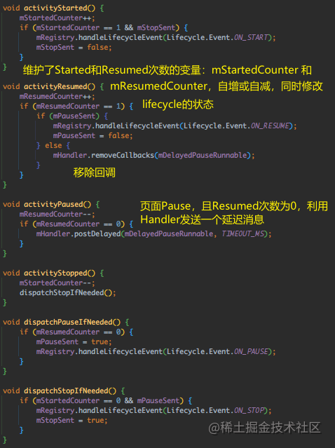 - Lifecycle.State.STARTED → 回调onStart()、onPause()后;