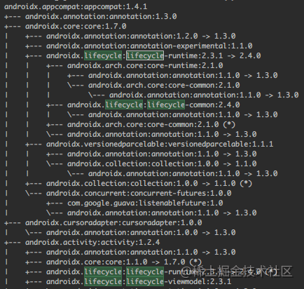 键入:gradlew :app:dependencies 查看依赖树,可以看到core、activity等模块都依赖lifecycle了~